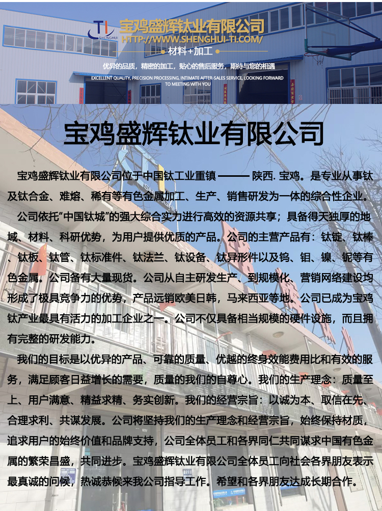 寶雞盛輝鈦業(yè)有限公司是一家主要從事鈦及鈦合金棒,鈦環(huán),鈦法蘭及鈦合金板材的高新技術(shù)企業(yè),公司提供鈦環(huán),鈦合金棒批發(fā),鈦環(huán)的生產(chǎn)工藝服務(wù),以人為本,質(zhì)量取勝為宗旨:18791863990,18740375975