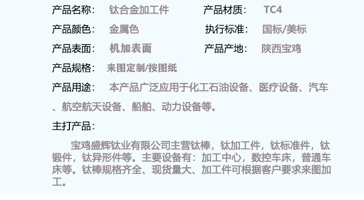 寶雞盛輝鈦業(yè)有限公司主營鈦棒,鈦加工件,鈦標(biāo)準(zhǔn)件,鈦鍛件,鈦異