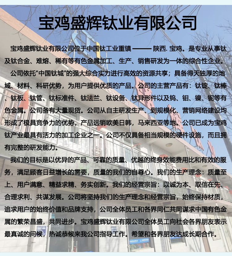 寶雞盛輝鈦業有限公司是一家主要從事鈦及鈦合金棒,鈦環,鈦法蘭及鈦合金板材的高新技術企業,公司提供鈦環,鈦合金棒批發,鈦環的生產工藝服務,以人為本,質量取勝為宗旨:18791863990,18740375975